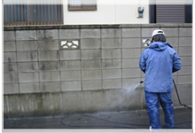 とてもきれい好きな奥様で、犬走り(建物周りのコンクリートでできた床)に、カビや藻が生えるたびにたわしでお掃除していたようで、今回は、どちらかというと、外壁よりもこっちがきれいになればという思いで、外壁塗装に踏み切ったようです。それならばと、ブロック塀も念入りに高圧洗浄サービスしちゃいました。