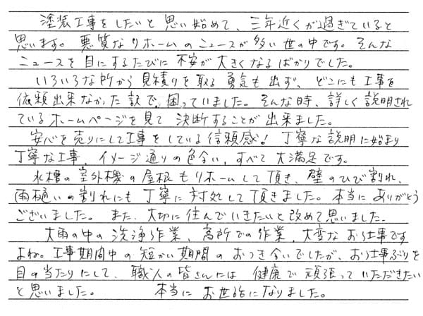 いろいろな所から見積もりを取る勇気も出ず、どこにも工事を依頼出来なかった訳で、困っていました。そんな時、詳しく説明されているホームページを見て決断することが出来ました。