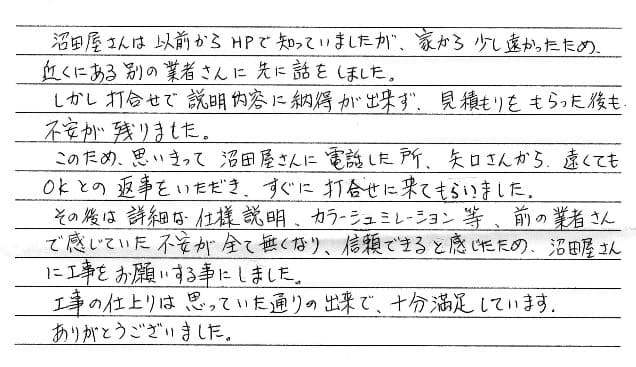 その後は詳細な仕様説明、カラーシュミレーション等、前の業者さんで感じていた不安がすべてなくなり、信頼できると感じたため、沼田屋さんに工事をお願いする事にしました。